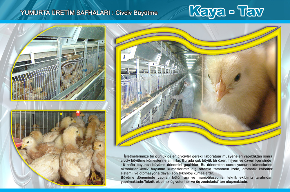 İşletmelerimize bir günlük gelen civcivler gerekli laboratuar muayeneleri yapıldıktan sonra civciv büyütme kümeslerine alınırlar. Burada çok büyük bir özen, hijyen ve özveri içerisinde