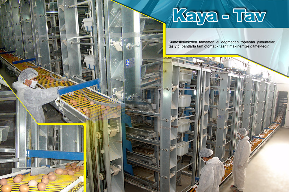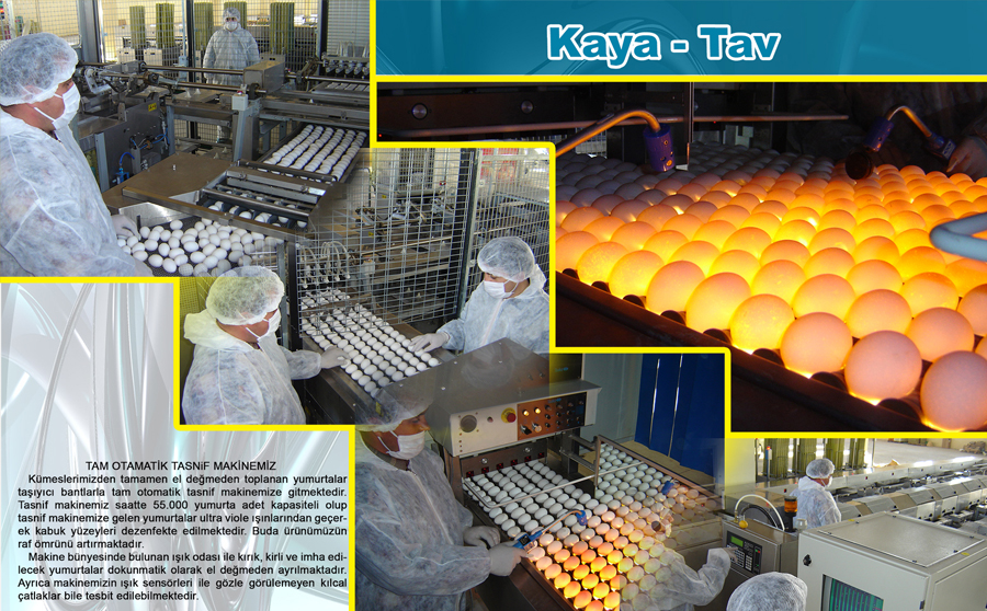 Kümeslerimizden tamamen el değmeden toplanan yumurtalar, taşıyıcı bantlarla tam otomatik tasnif makinemize gitmektedir. Makine bünyesinde bulunan ışık odası ile kırık, kirli ve imha edilecek yumurtalar dokunmatik olarak el değmeden ayrılmaktadır. Tasnif makinemiz saatte 55.000 yumurta adet kapasiteli olup tasnif makinemize gelen yumurtalar ultra viole ışınlarından geçerek kabuk yüzeyleri dezenfekte edilmektedir. Buda ürünümüzün raf ömrünü artırmaktadır.