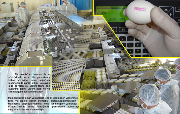 Makinemiz’de bulunan lazer püskürtmeli yazıcı ile yumurtanın kabuk yüzeyine, insan sağlığına hiçbir şekilde zararlı etkisi olmayan gıda boyaları ile, üretim tarihi, son kullanma tarihi, üretim parti no ve şirket logosu basılabilmektedir.