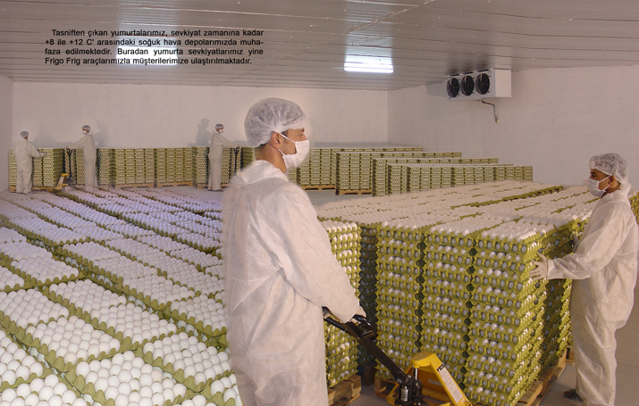Tasniften çıkan yumurtalarımız, sevkiyat zamanına kadar +8 ile +12 C' arasındaki soğuk hava depolarımızda muhafaza edilmektedir. Frigo Frig araçlarımızla müşterilerimize ulaştırılmaktadır...